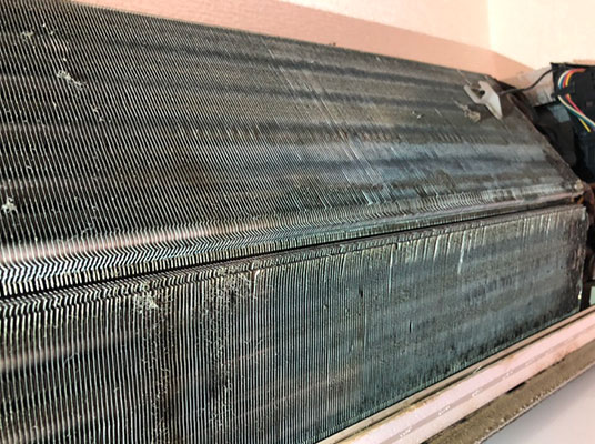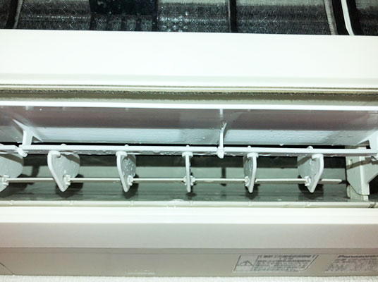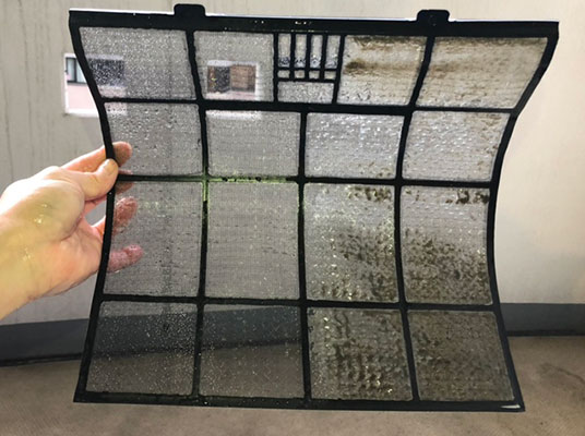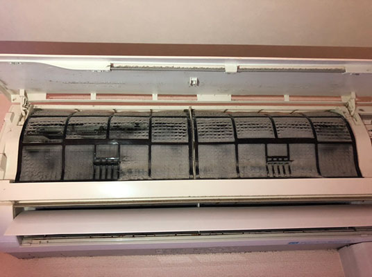 洗浄前のエアコン、フィルターに汚れがたくさん