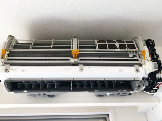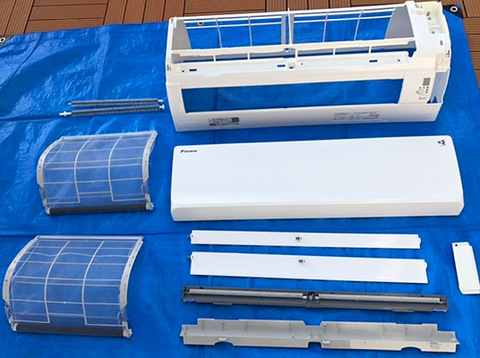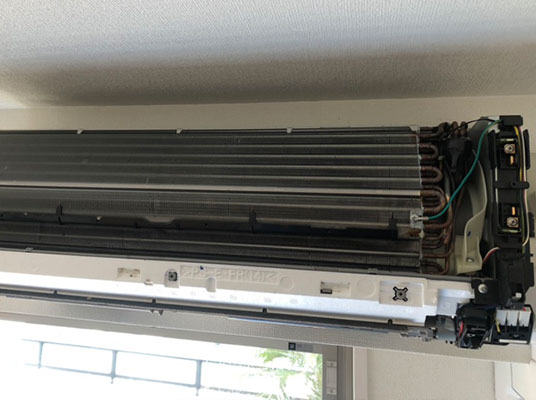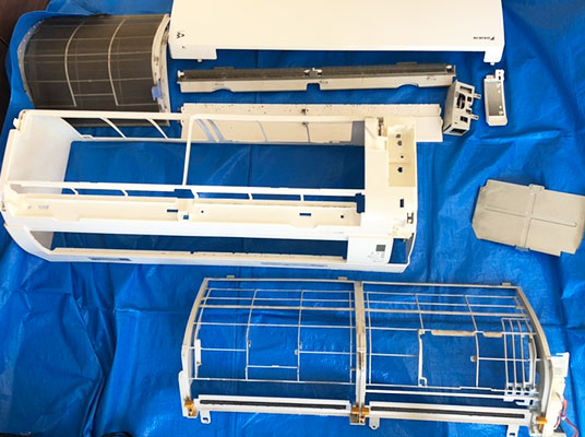分解して内部(冷却フィン・回転ファン)を高圧洗浄ですみずみまでピカピカにすることでカビ・においがすっきりします。