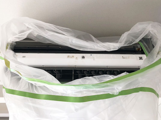 基盤やモーターに洗浄剤や水がかからないよう丁寧に養生します