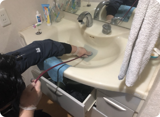 雑排水管清掃とは、お部屋のキッチン・バスルーム・洗面所・洗濯機置場の排水管を高圧の水流を使って掃除します。