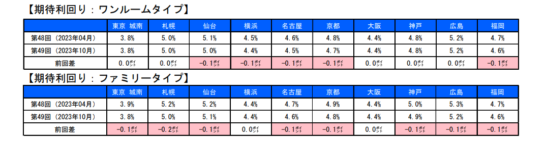 下記の表は、全国のおもな政令指定都市の期待利回りを一覧にしたものです。期待利回りは投資家が期待する利回りのことで、実際の表面利回りとはやや異なりますが、利回り相場の把握はできます。
