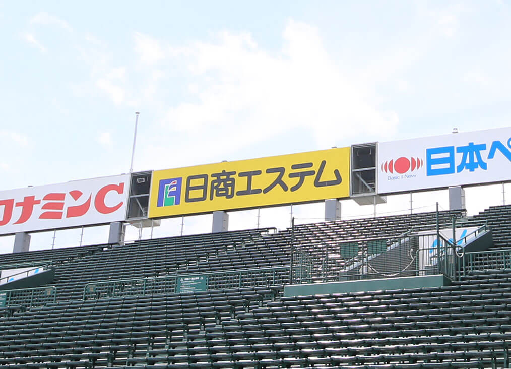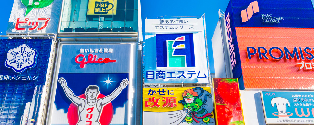 高校野球中継の際によく目にする甲子園球場・一塁側アルプススタンドの看板や大阪・道頓堀にある巨大な企業広告看板は有名で、