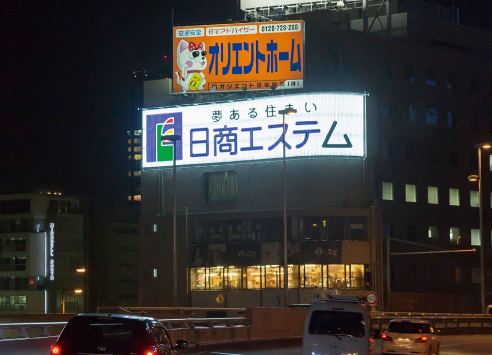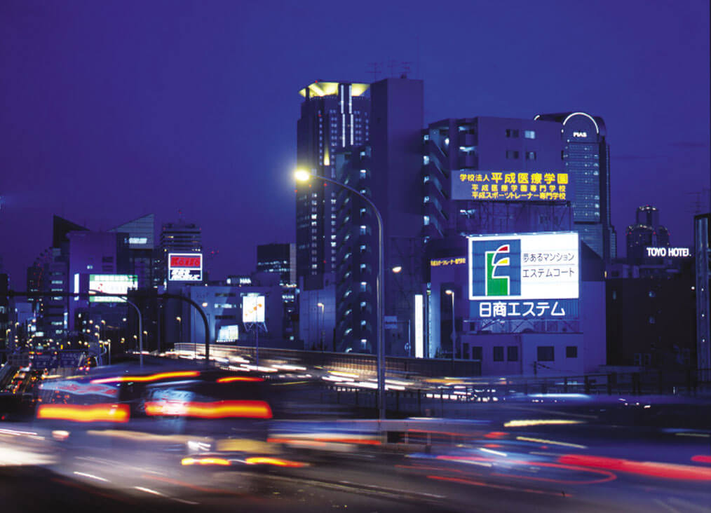 日商エステムグループは、テレビコマーシャルをはじめ、新聞・雑誌広告など様々なメディアで幅広い広告活動を展開中。 皆さんも、街のいたるところにある看板やポスターで日商エステムの名をご覧になったことがあるのでは? 中でも大阪・道頓堀にある巨大な企業広告看板は有名。 河面に映る鮮やかなイルミネーションの中でもひときわ映えています。