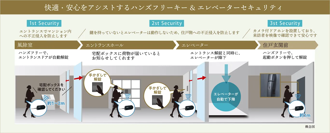 まるで一戸建てのようなプライベート感を感じられる設計です。さらに、ドアロックにはGOAL社製のハンズフリーキーを採用し、