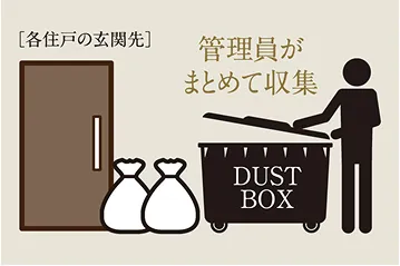 指定日時に各住戸の玄関先にゴミを出しておくだけで回収してくれる「ゴミ回収サービス」。1階まで降りてゴミ出しをする面倒な手間を省きます。