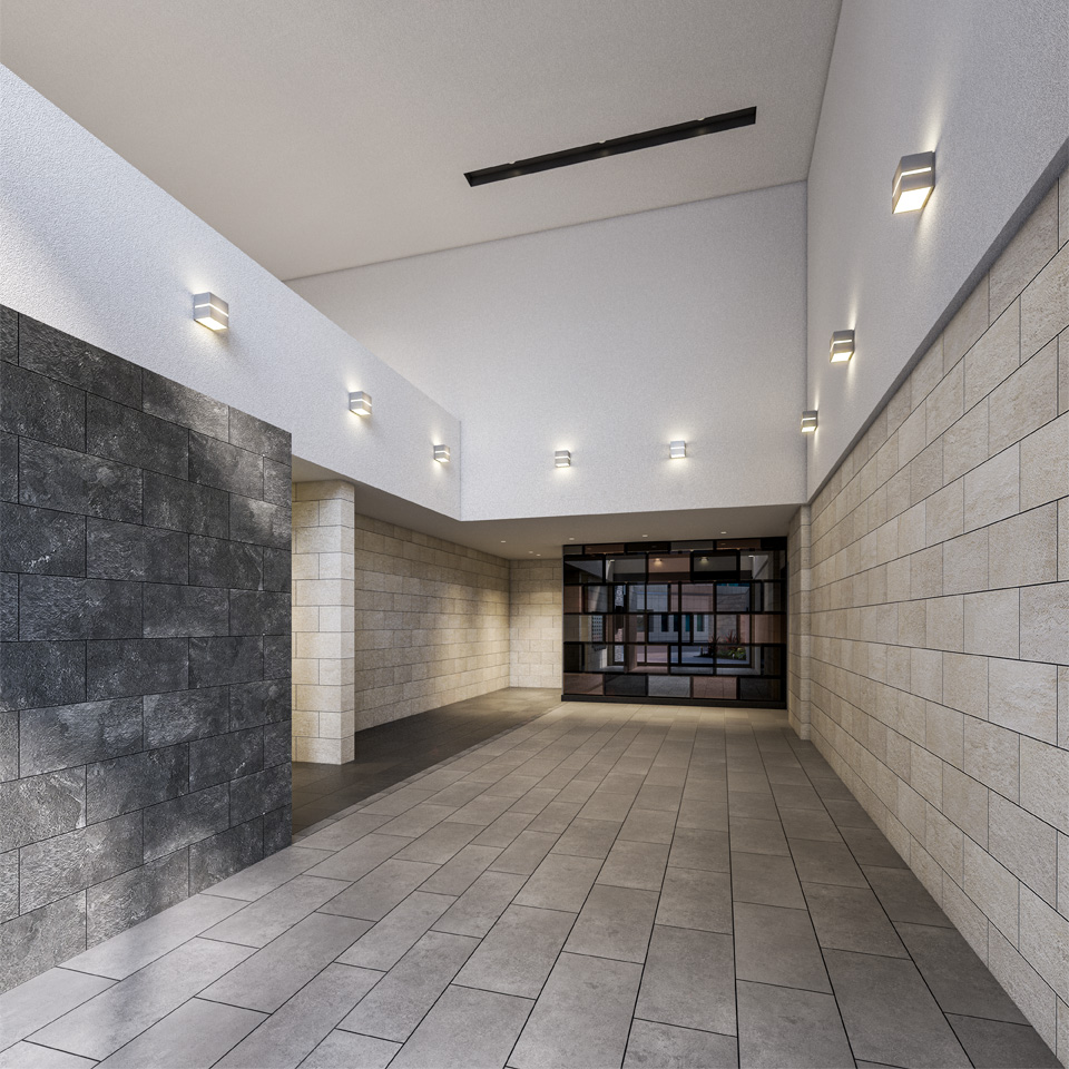 住まう方を誇らしさで迎え入れるアプローチにこだわり、吹き抜けを活かしたデザインを採用。