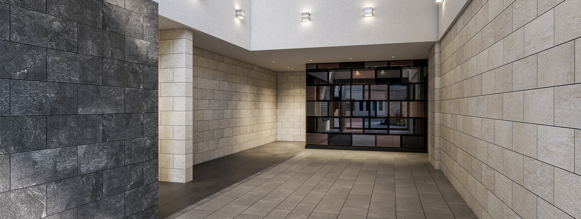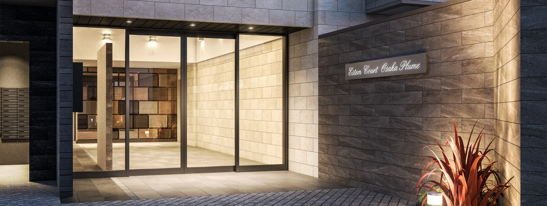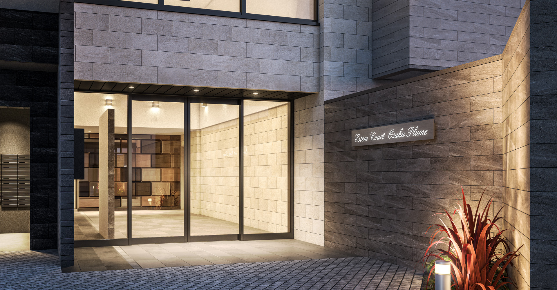 シックなダークグレーを基調に、垂直ラインを強調するマリオンが伸びやかな印象を創出。