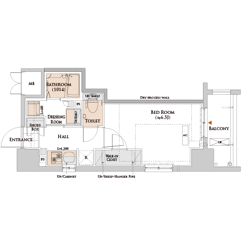 お部屋は1Kタイプのスタンダードなものをご用意していますが、脱衣所やウォークインクローゼットを備えるなど、利便性と収納力に優れます。