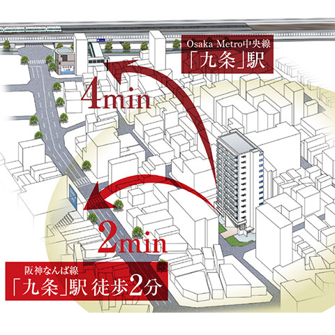 阪神なんば線「九条駅」徒歩2分、Osaka Metro中央線「九条駅」徒歩4分という都心直結の2WAYアクセスを確保して完成しました!