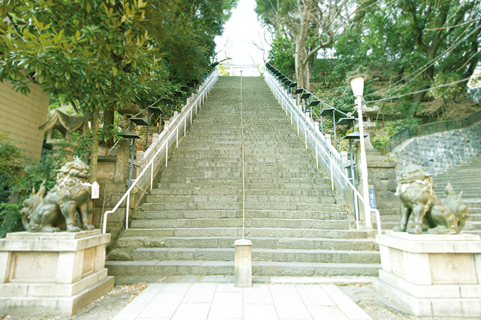 「誰か馬で階段を駆け上り、あの梅の枝を取って参れ」。頂上へ至る石段は、86段40度という傾斜角。