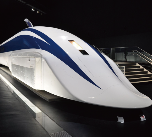 最高時速500kmで走行する超電導磁気浮上式リニアモーターカー。