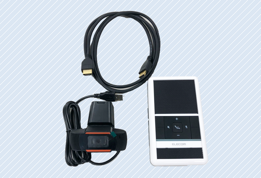 テレワーク応援セットには、「HDMIケーブル1本」「Webカメラ」「マイク内蔵スピーカーフォン」の3点をご用意。